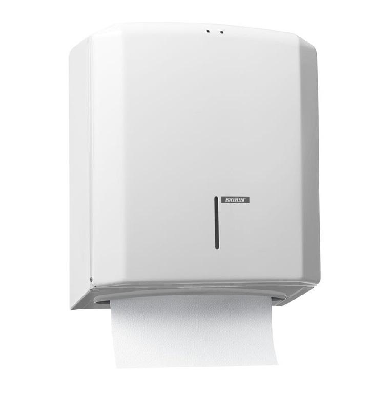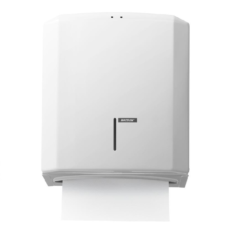 Katrin 77519 to systemowy dozownik do papieru toaletowego na dwie rolki Katrin System. Jest zrobiony pod toalety z większym ruchem: ma działać bez przestojów, ograniczać „wyciąganie na zapas” i ułatwiać serwis (uzupełniasz, kiedy chcesz, bez czekania aż skończy się rolka).