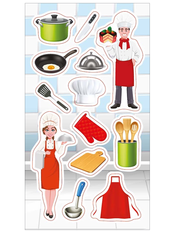 Zestaw naklejek do ozdoby zeszytów, albumów, listów, pocztówek … 13 naklejek związanych z pracą kucharza. POLECANE DO SZKÓŁ