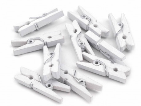 Drewniane klamerki w kolorze białym do przypinania fotografii, karnecików przy prezentach, winietek na stół, dekorowania stroików, bukietów, doniczek, kartek okolicznościowych, doskonałe uzupełnienie dla techniki scrapbookingu.