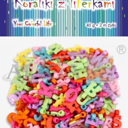 Koraliki plastikowe z literkami, wys. 2cm/40szt, żyłka elastyczna 2m PJA-8541
